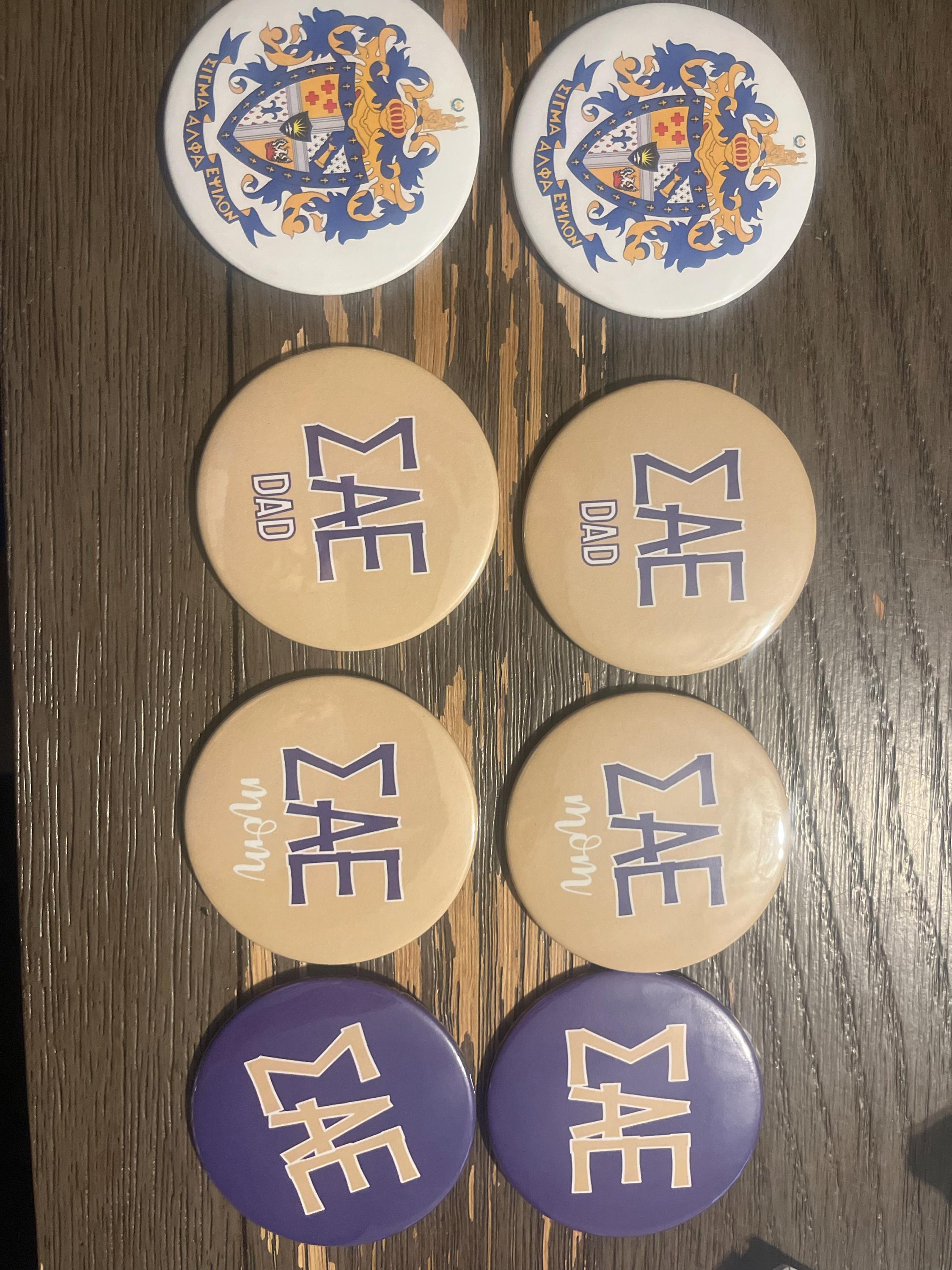 Mom and Dad buttons, along with the official crest and purple ΣΑΕ help show your ΣΑΕ pride!