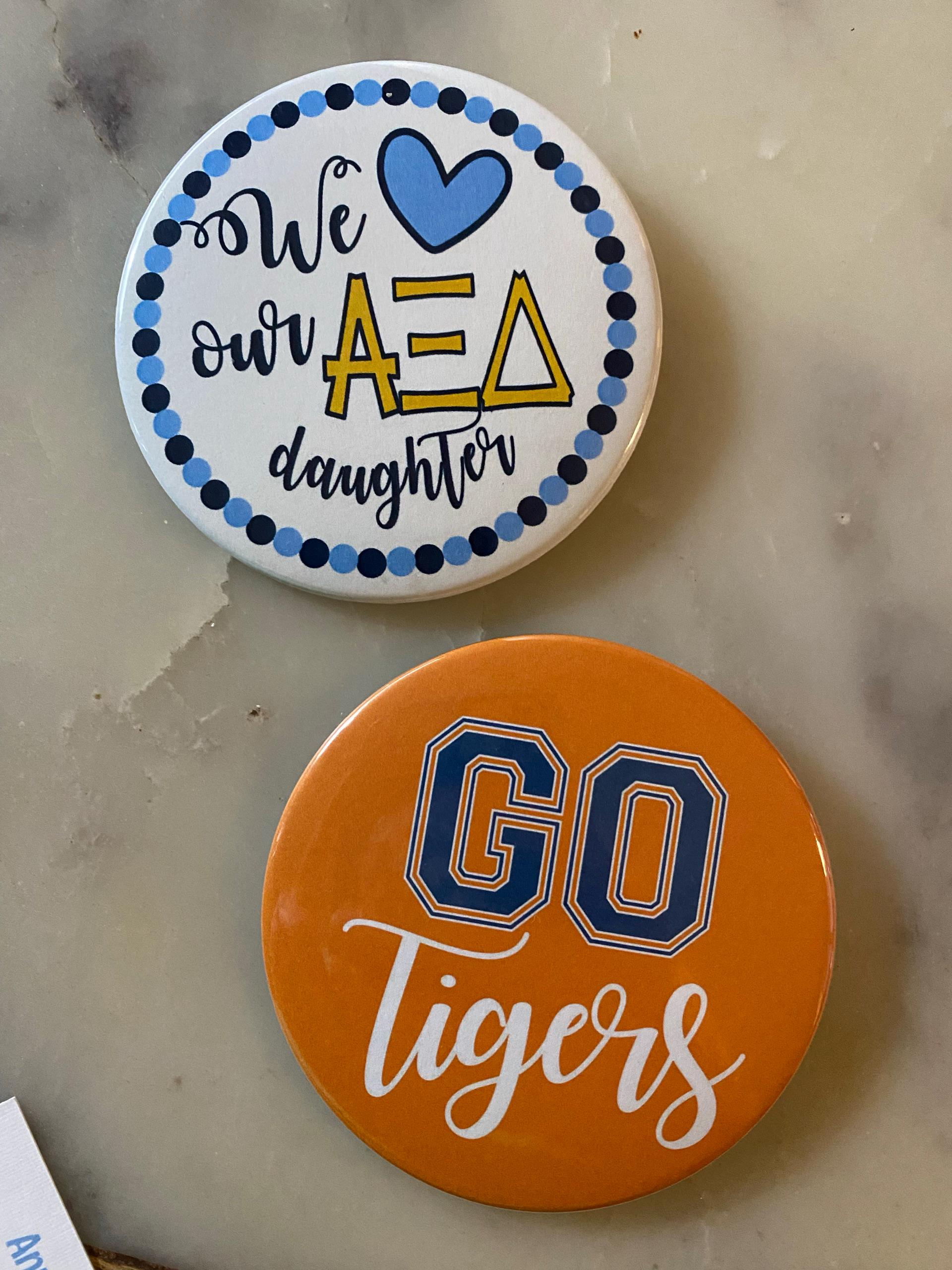 Adorable, original design, sorority 3" Game Day Button! Super cute sorority Mom/Dad button helps parents show the love for their sorority daughter. Eighteen sororities available. These designs are officially licensed through Affinity and CLC.