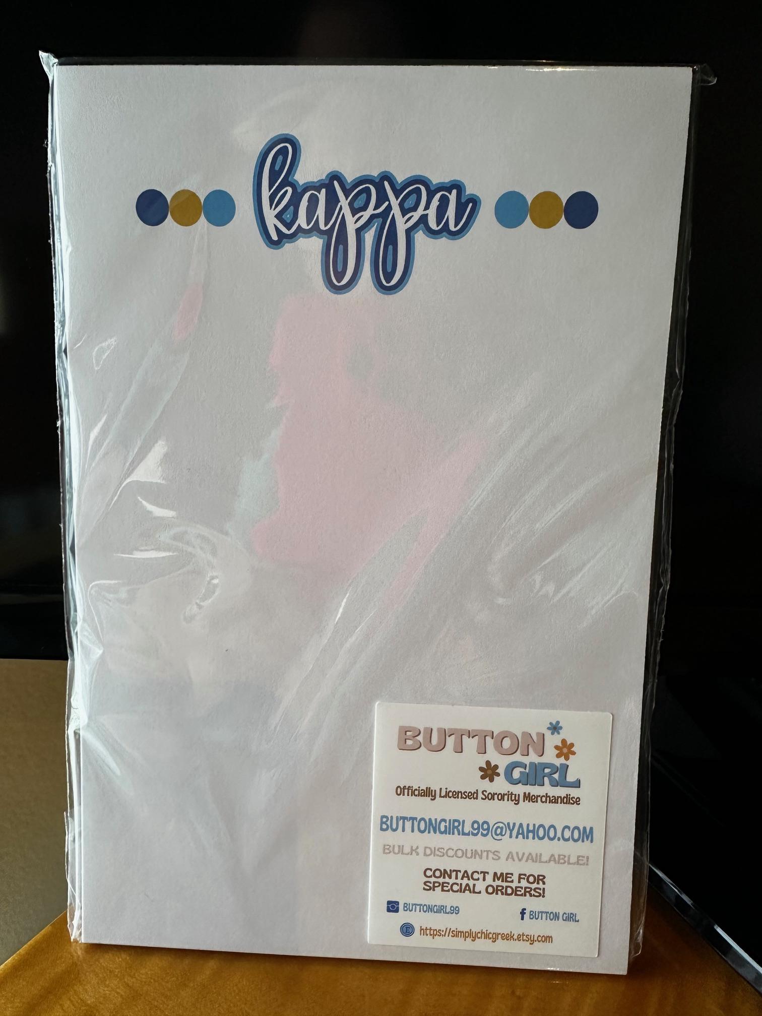 Adorable original design sorority note pad in vibrant colors! 8.5" x 5.5" tablet with 50 sheets and cardboard backing. Nineteen sororities available. These designs are officially licensed through Affinity and CLC.