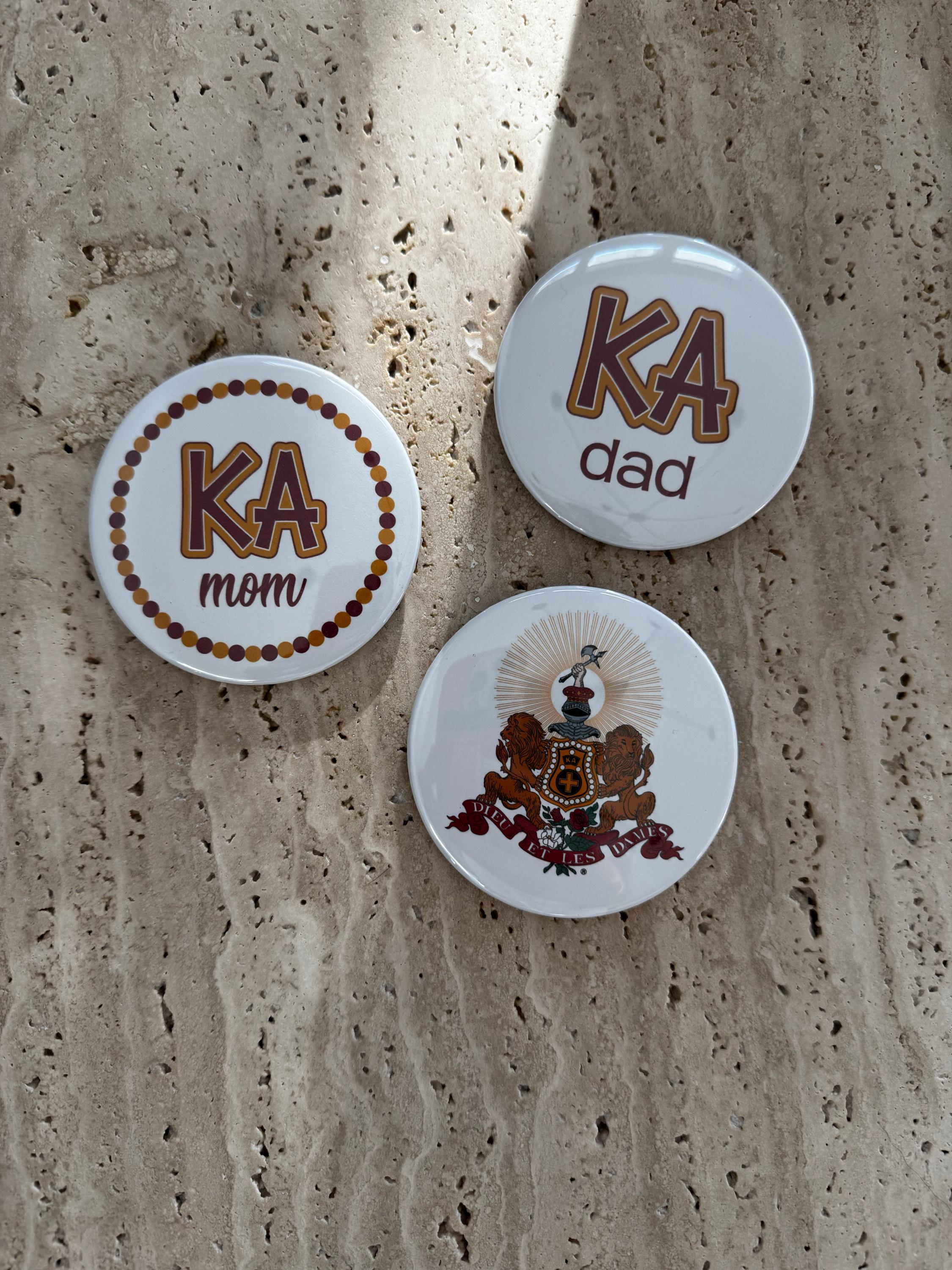 Mom and Dad buttons, along with the official crest help show your KA pride!