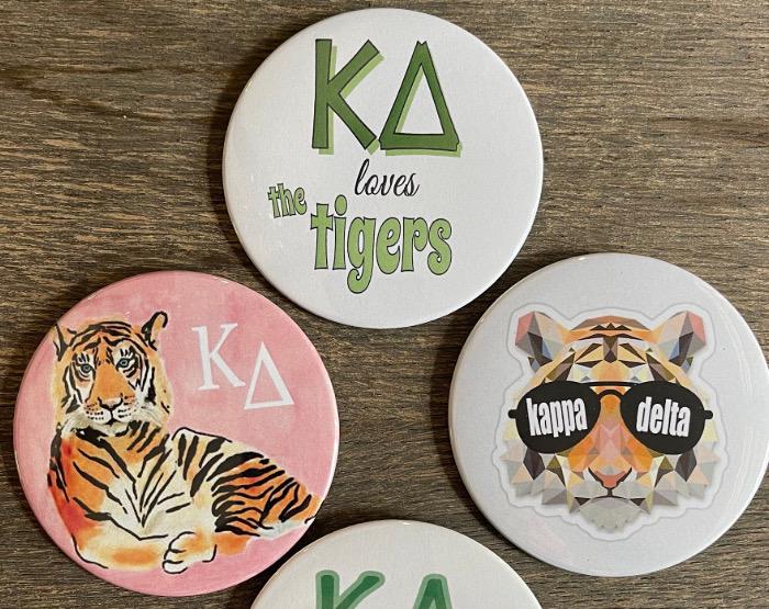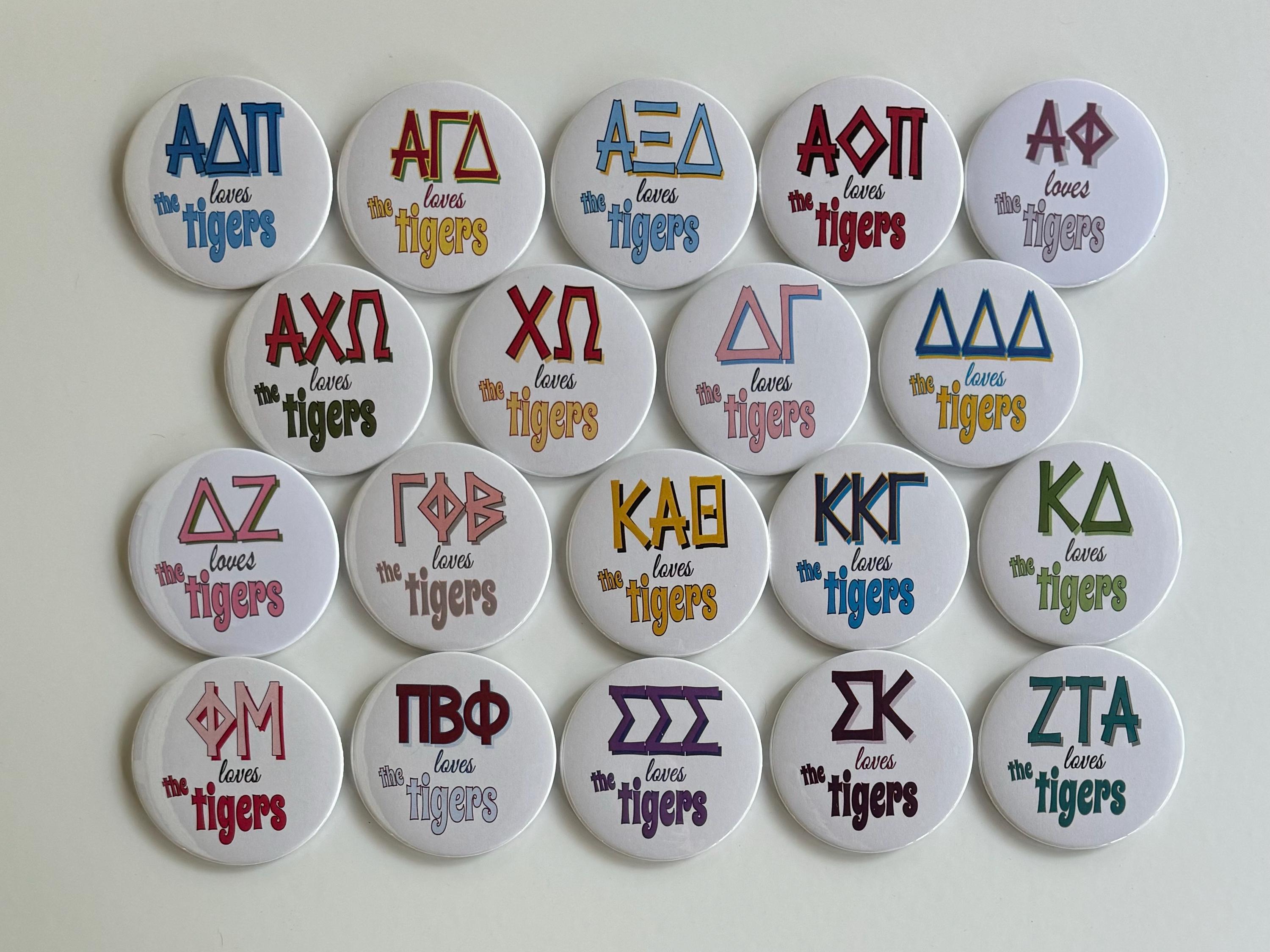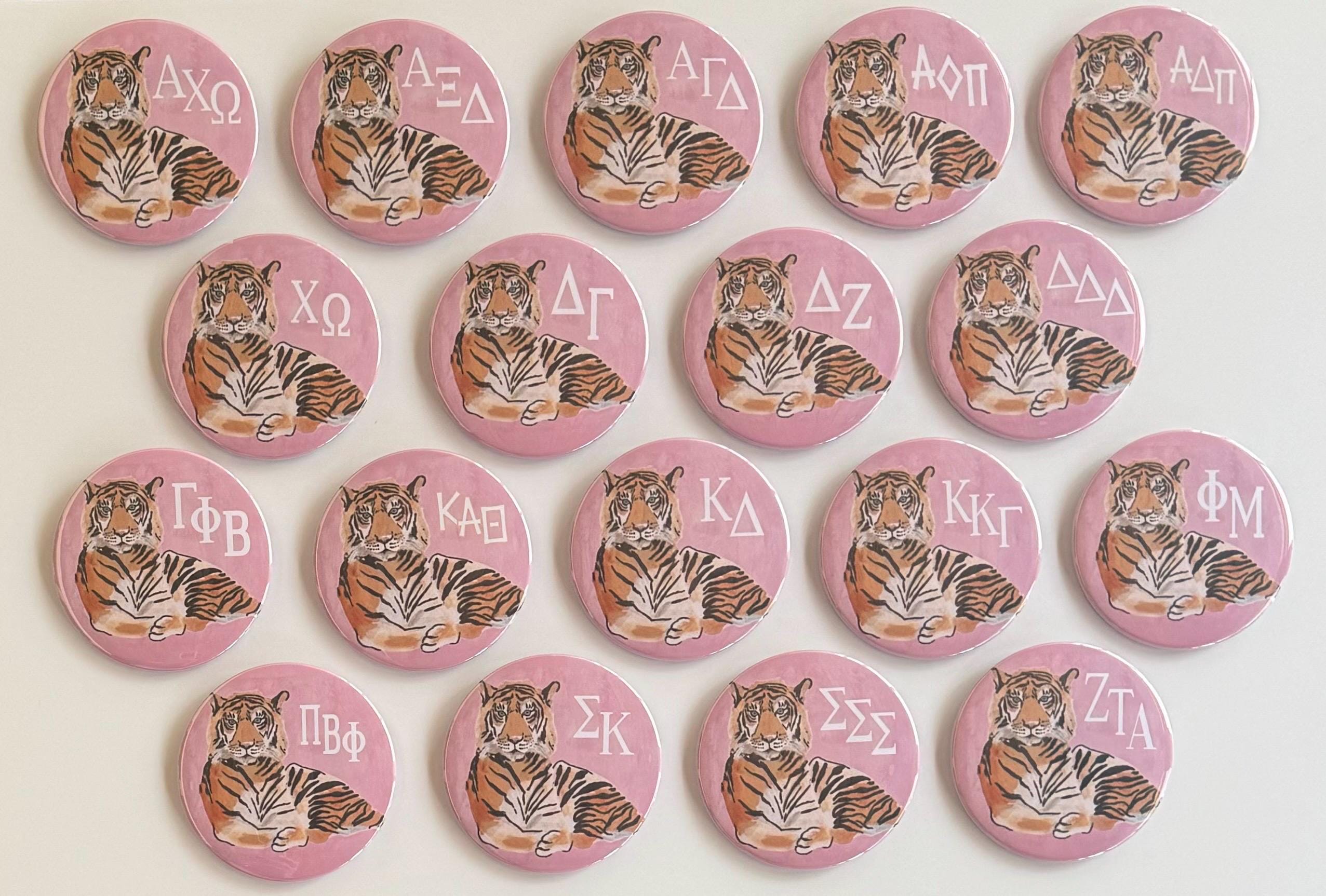 Adorable original tiger designs for your sorority in 3" Game Day Buttons! Super cute designs look great on backpacks, bulletin boards or your outfit on game day! These make excellent big/little gifts but are also great "happies" for any occasion. Nineteen sororities available. These designs are officially licensed through Affinity and CLC.