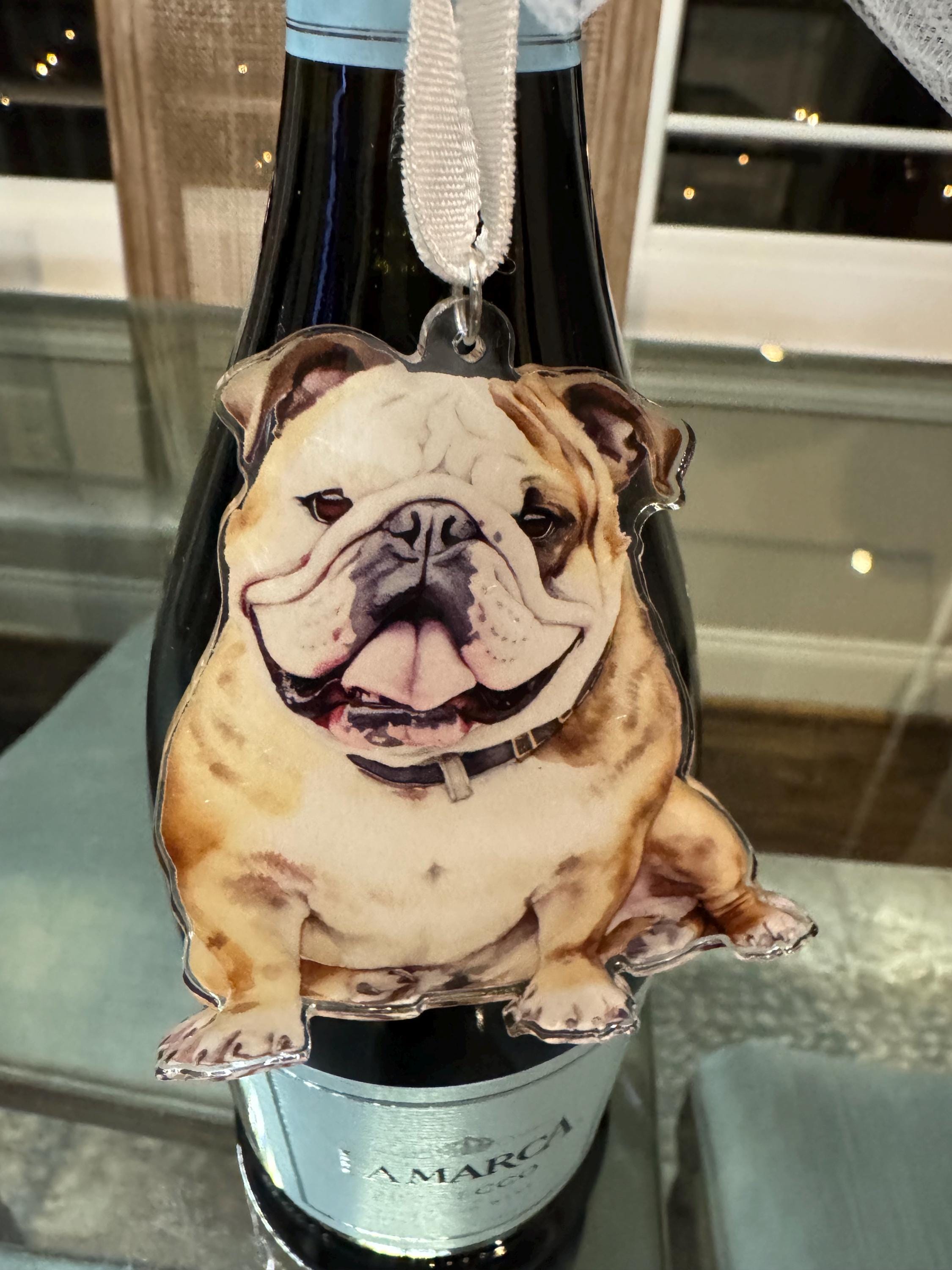 3.5” tall acrylic Bulldog design is 3.29” wide. Bottle charm/Ornament with ribbon - ribbon may vary.