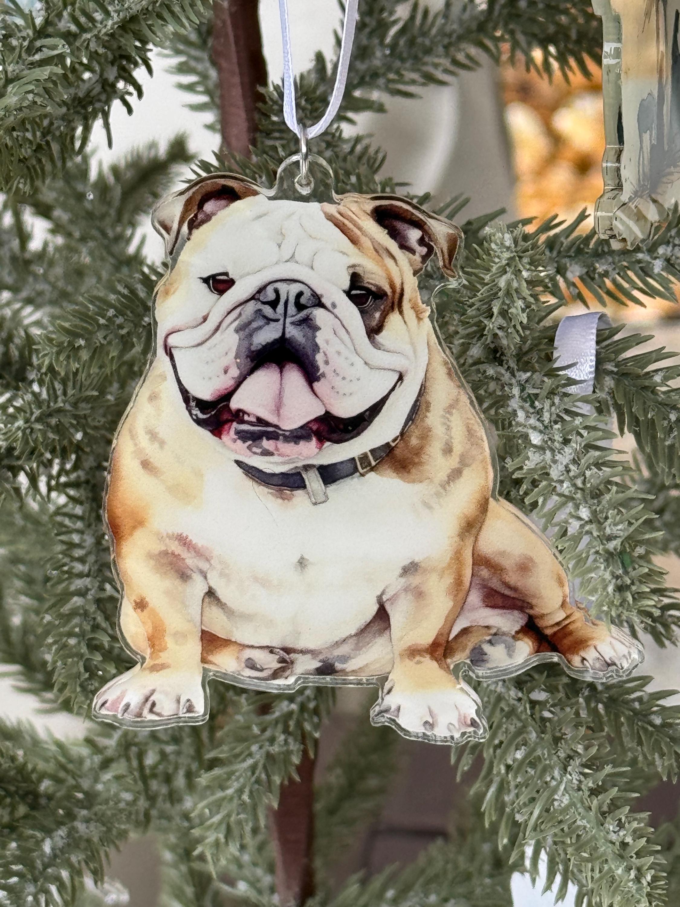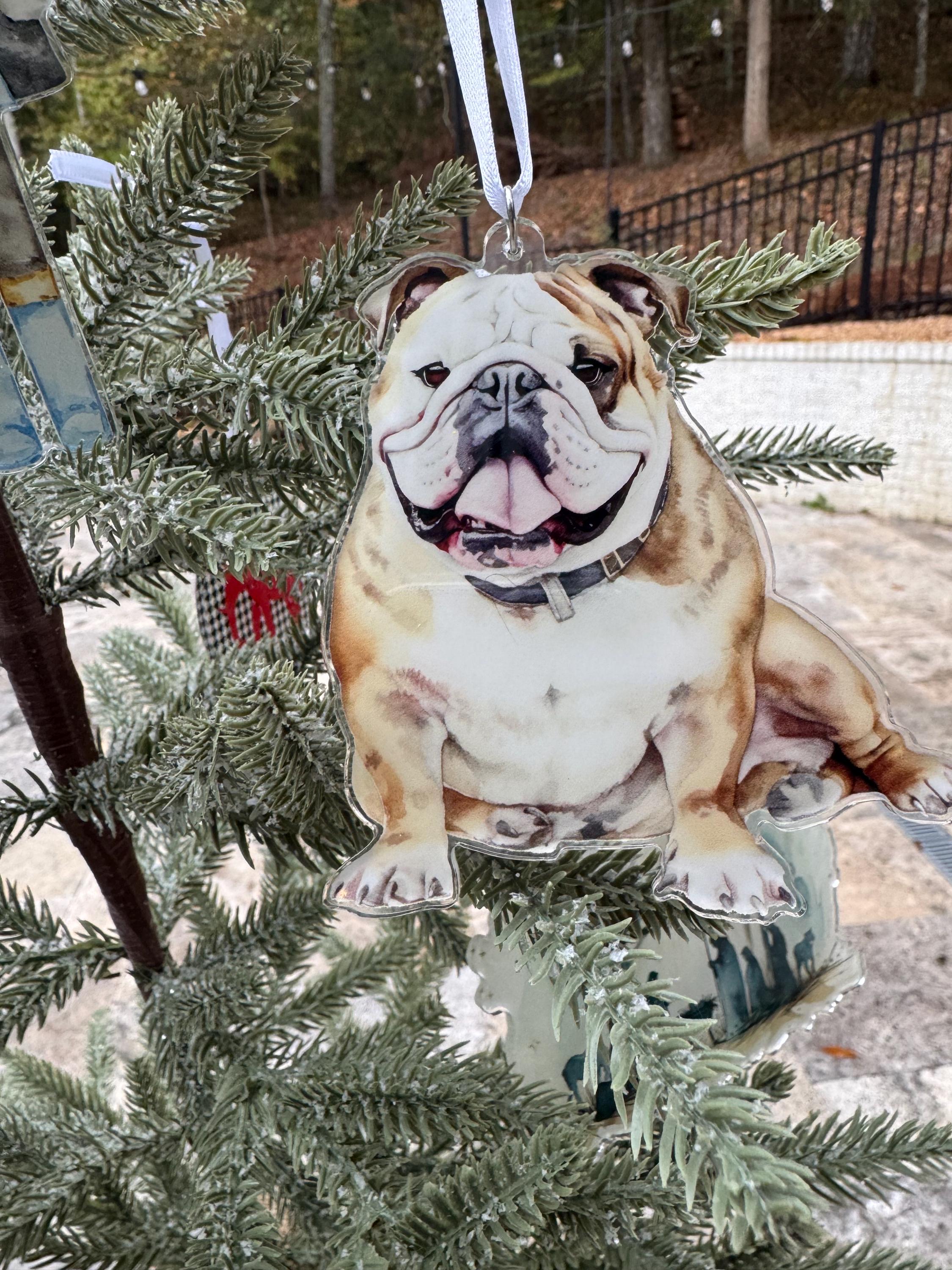 3.5” tall acrylic Bulldog design is 3.29” wide. Ornament with ribbon - ribbon may vary.