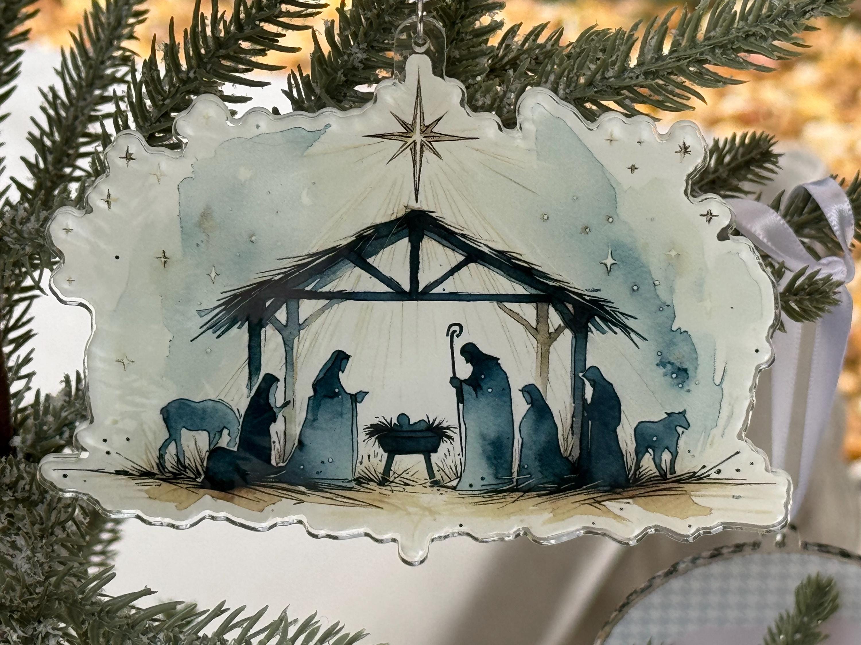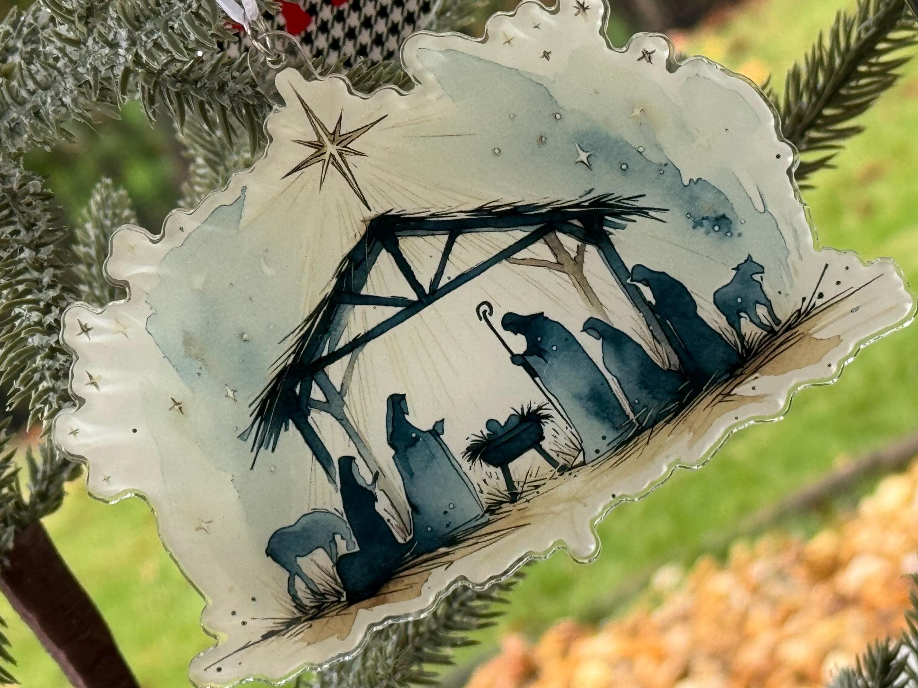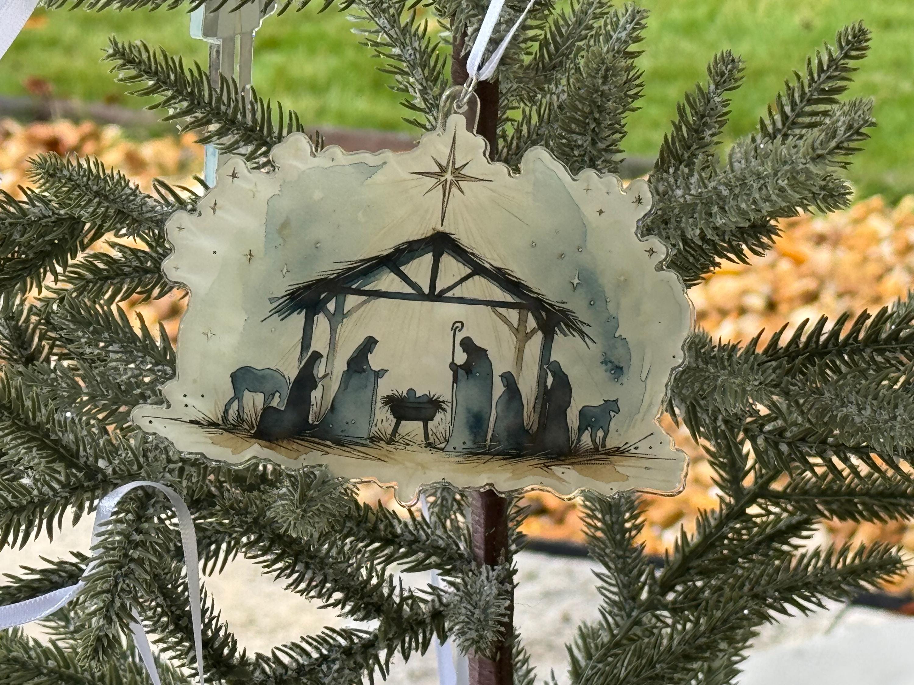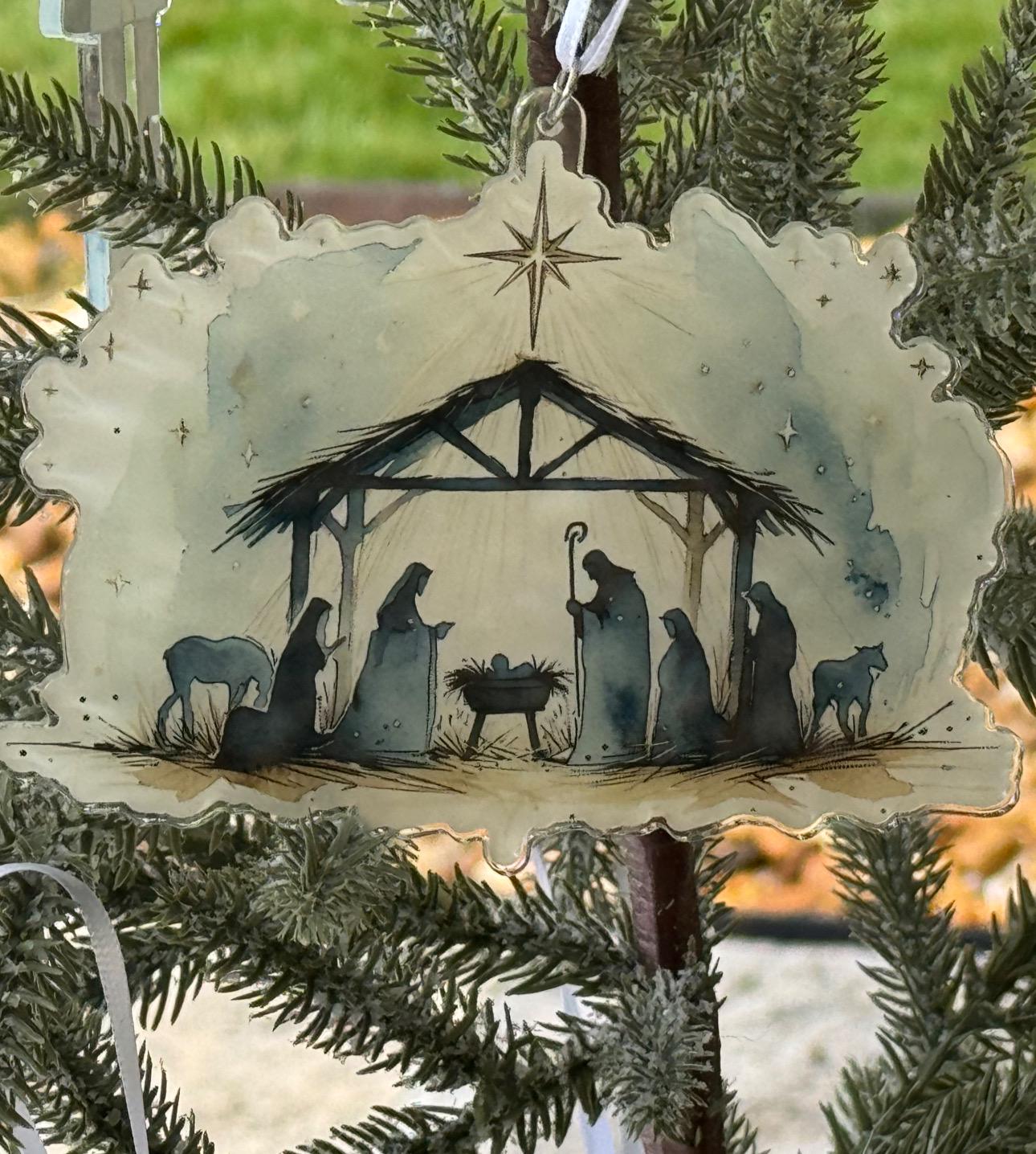 5” wide acrylic Nativity design is 3.5” tall. Ornament with ribbon - ribbon may vary.