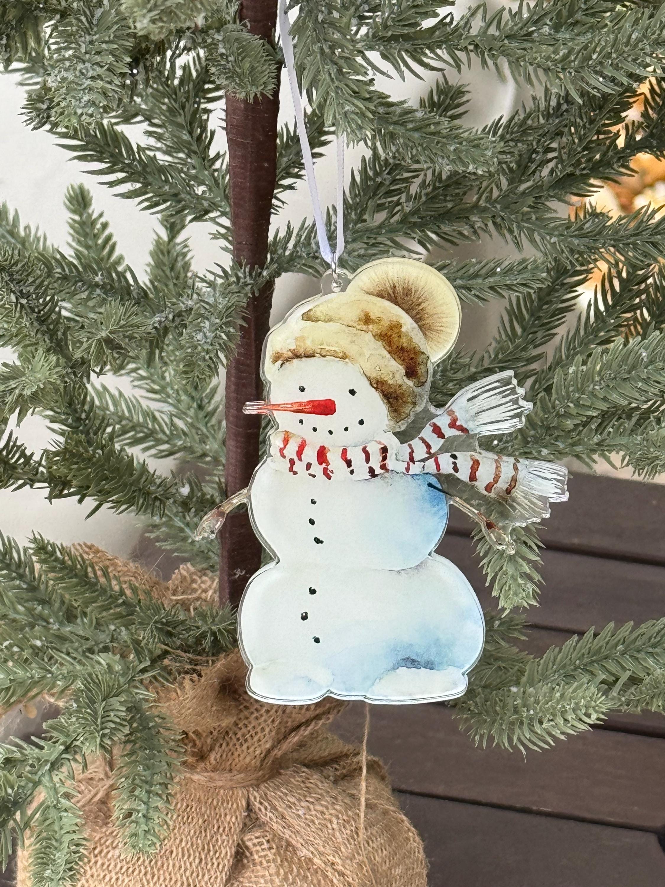 5” tall acrylic snowman design is 3.89” wide. Ornament with ribbon - ribbon may vary.