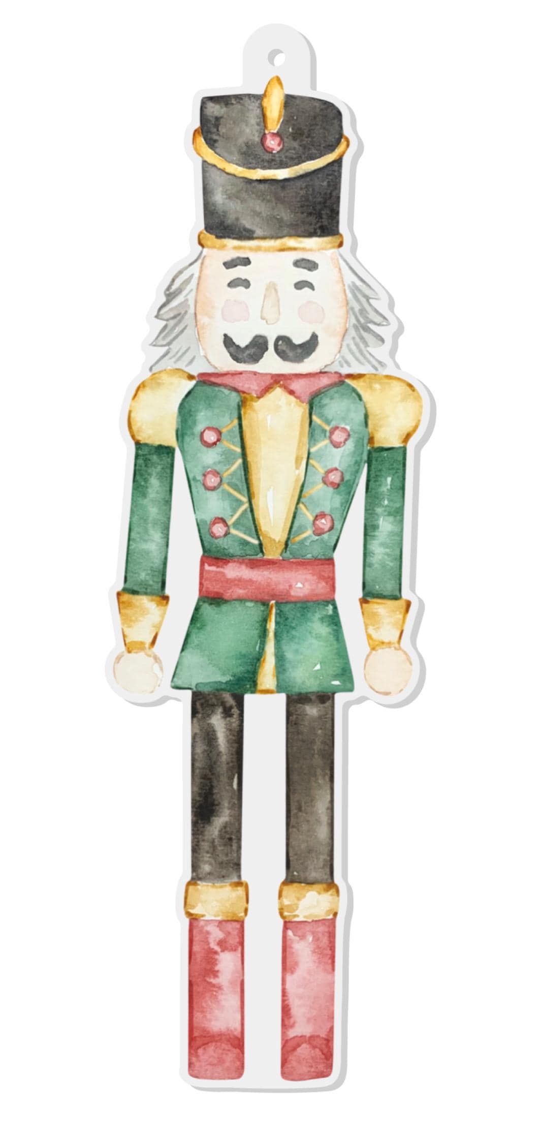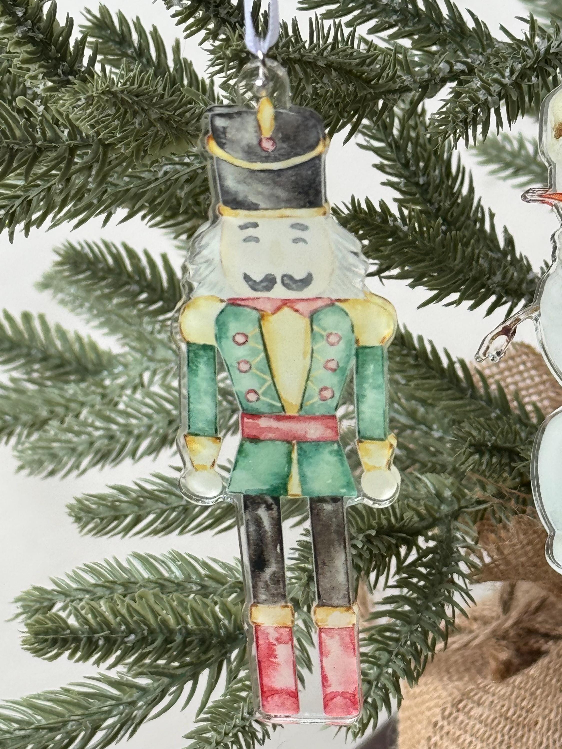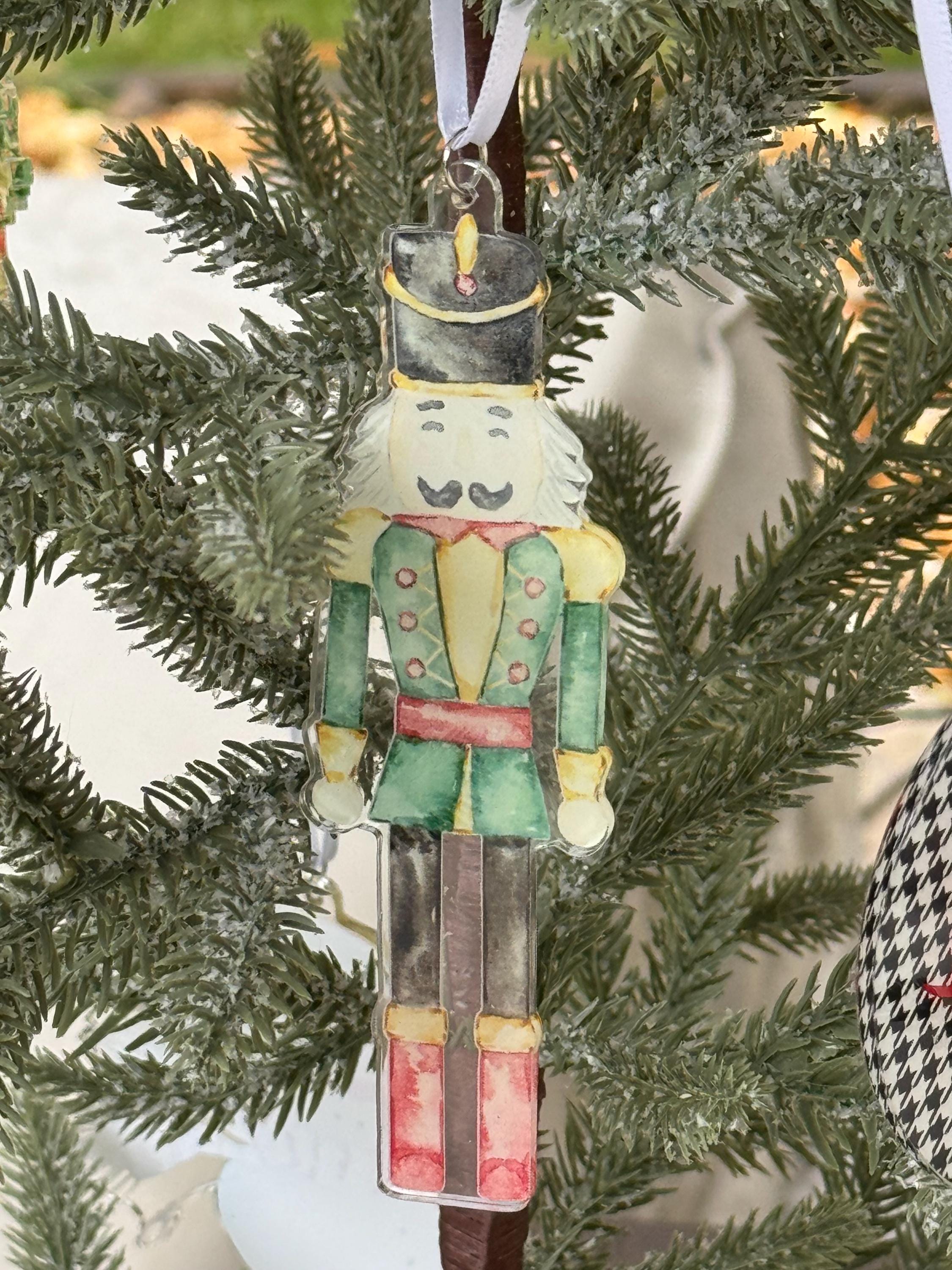 5” tall acrylic Nutcracker design is 1.6” wide. Ornament with ribbon - ribbon may vary.