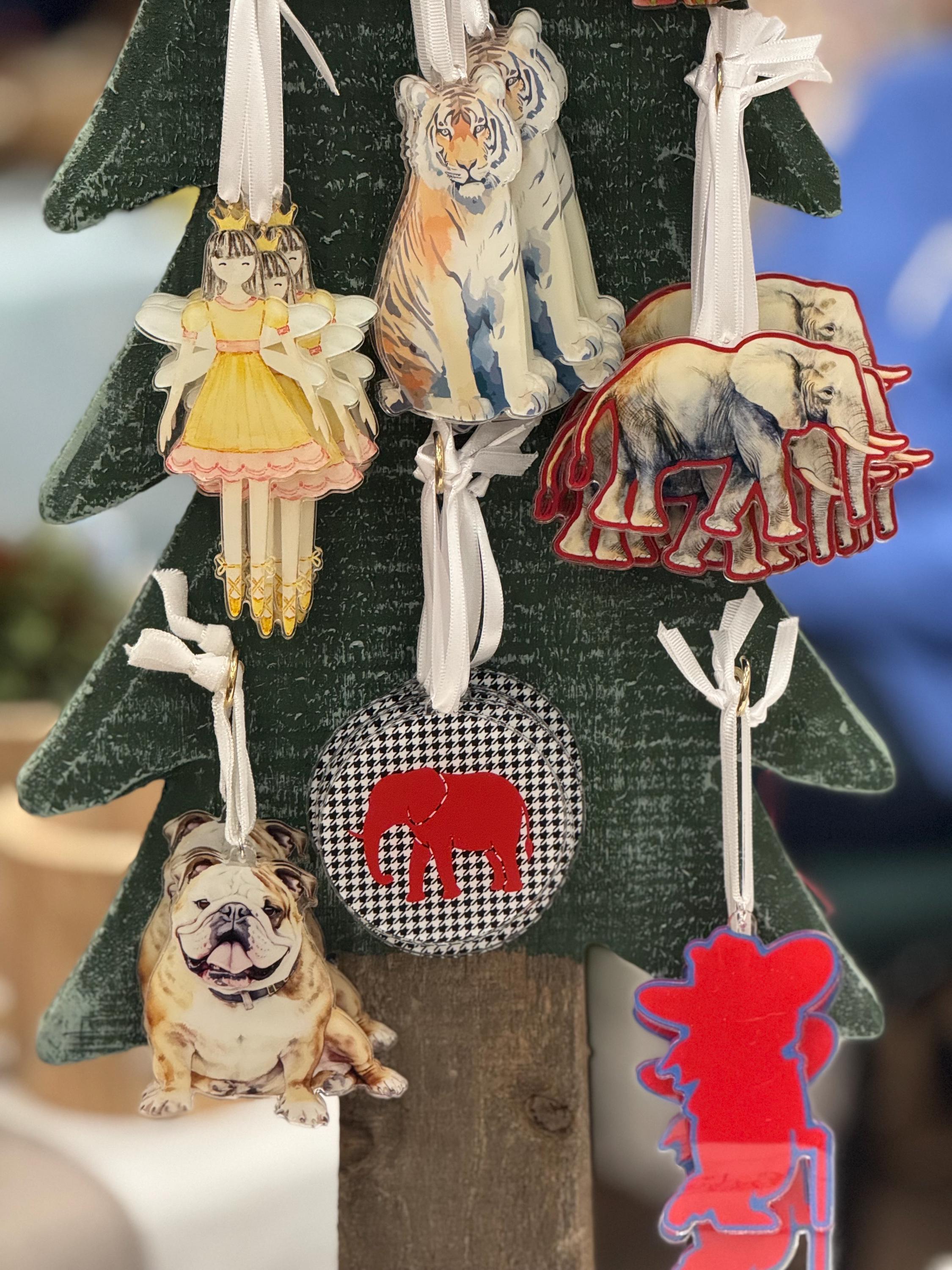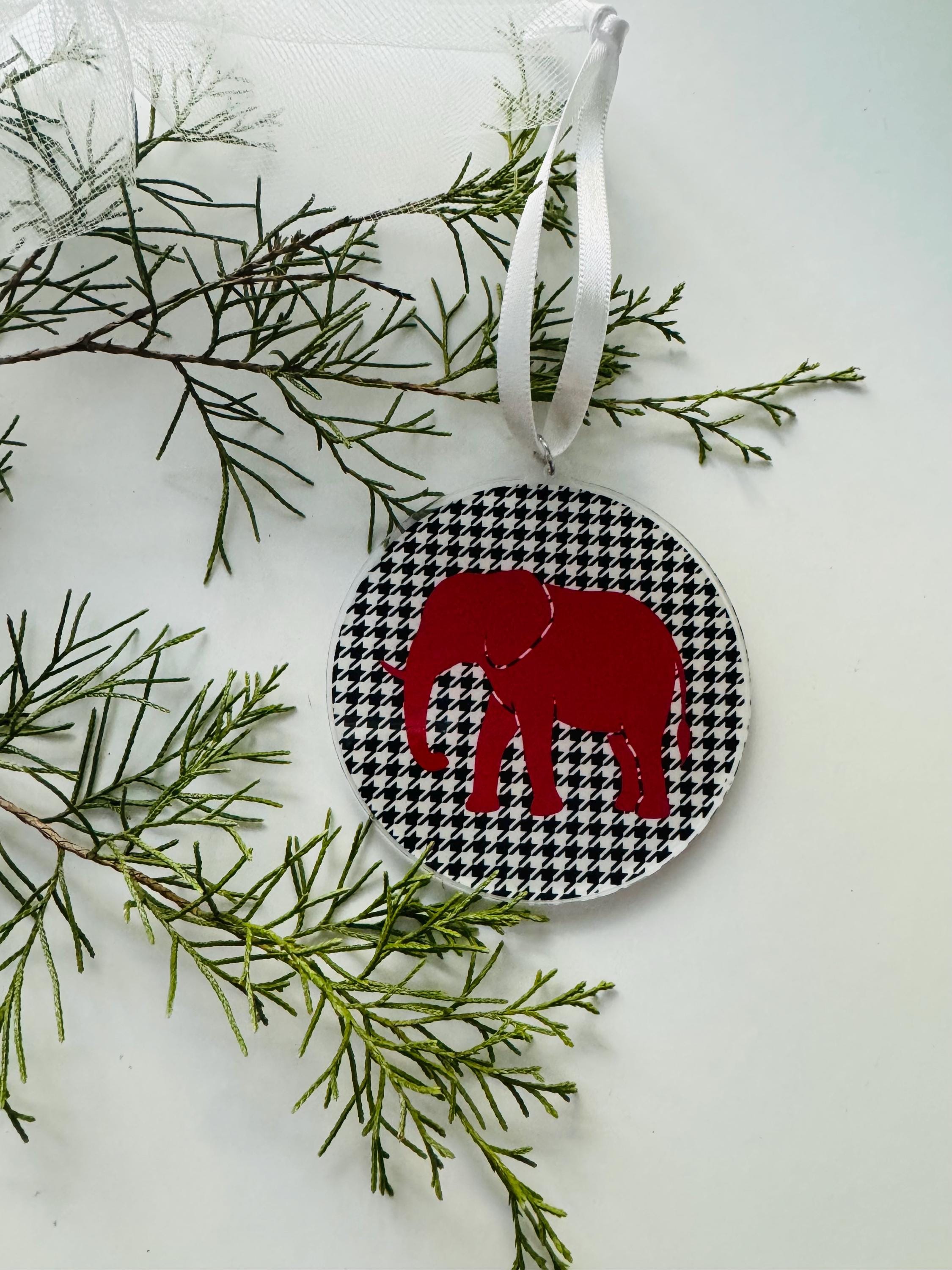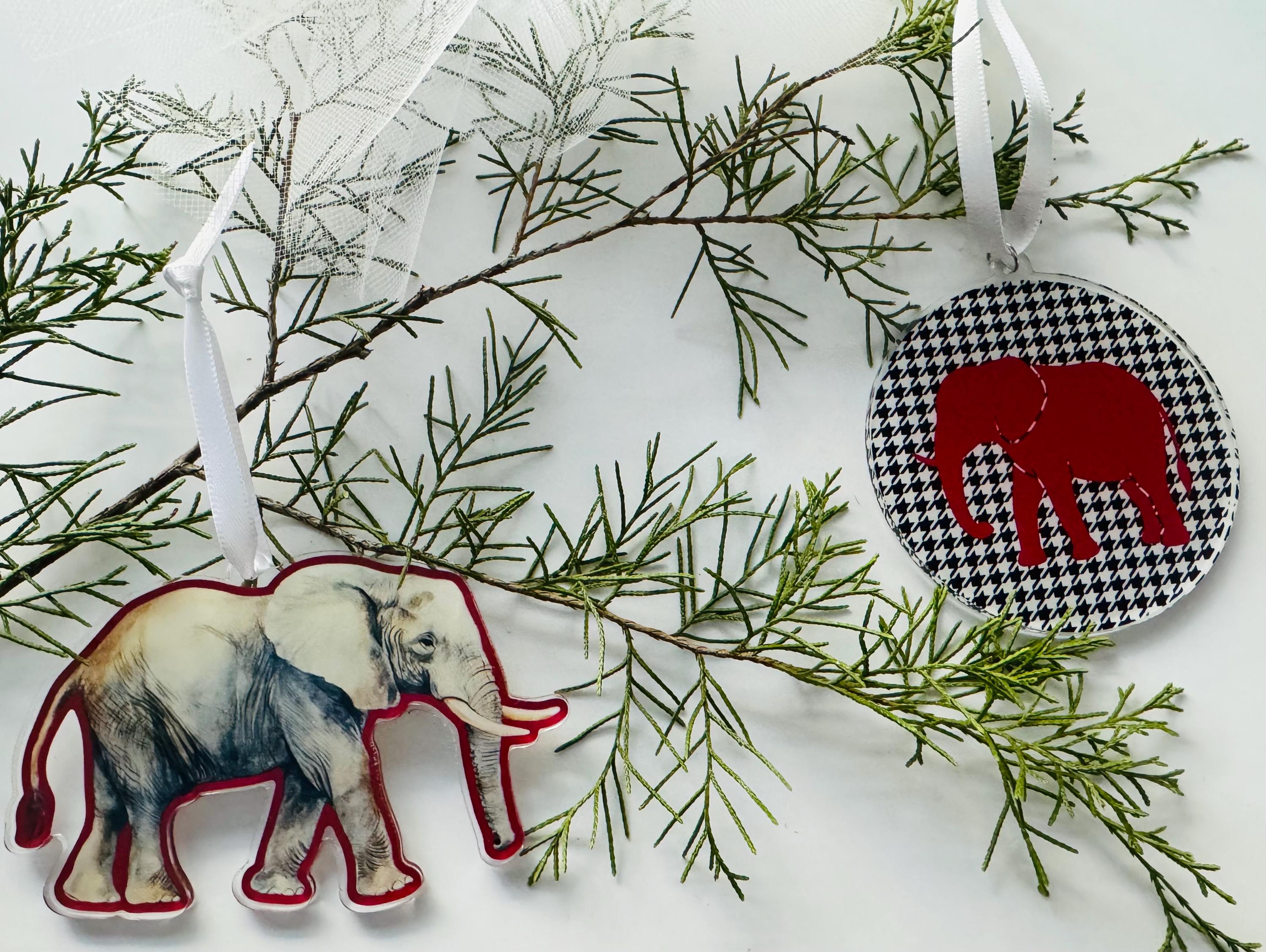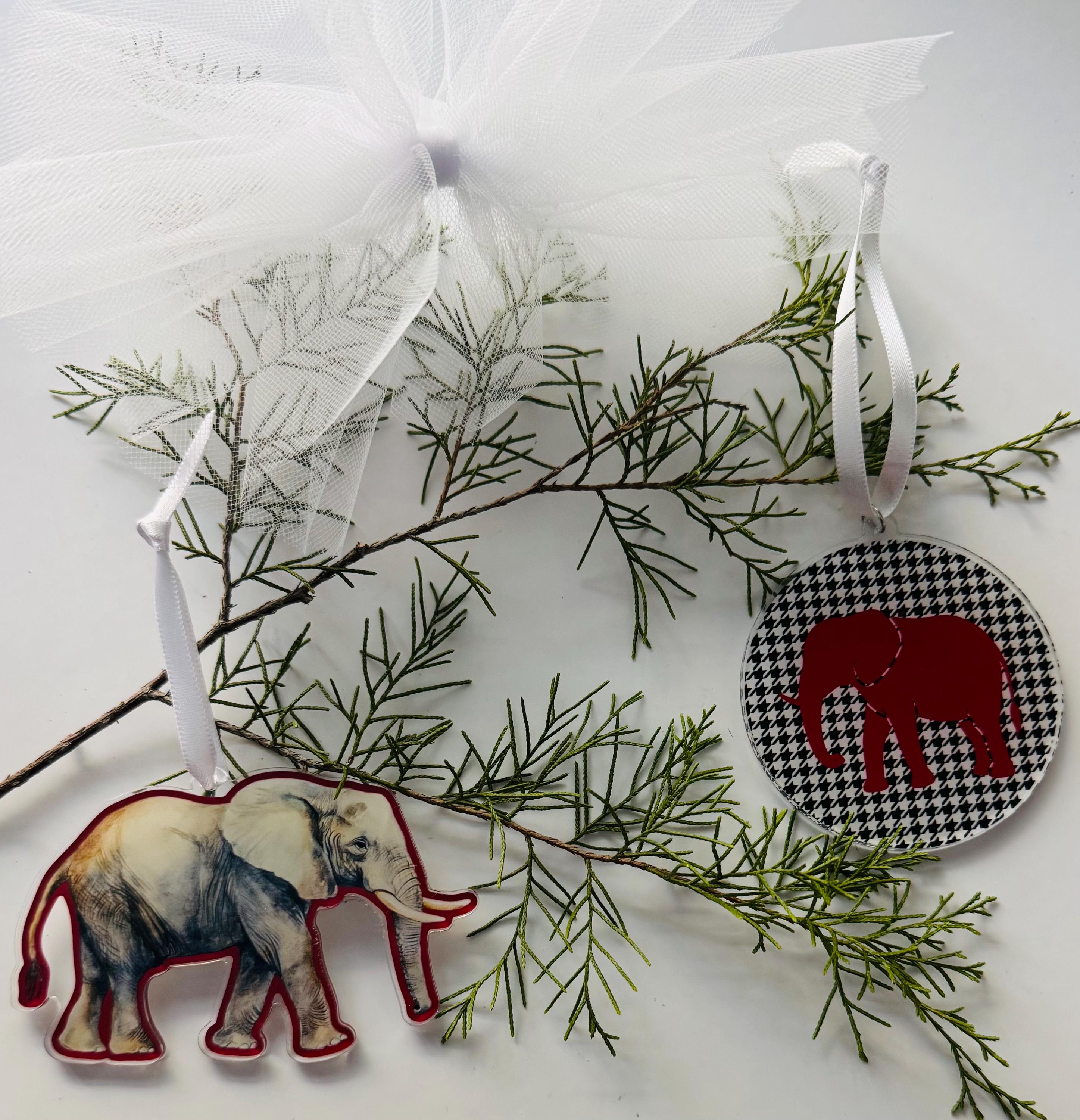 Two fun elephant designs for your favorite Alabama football fan or for yourself! They are both acrylic and come with a white ribbon. They also make a cute bottle charm for a hostess gift!